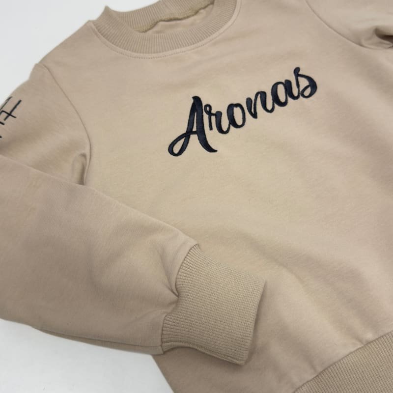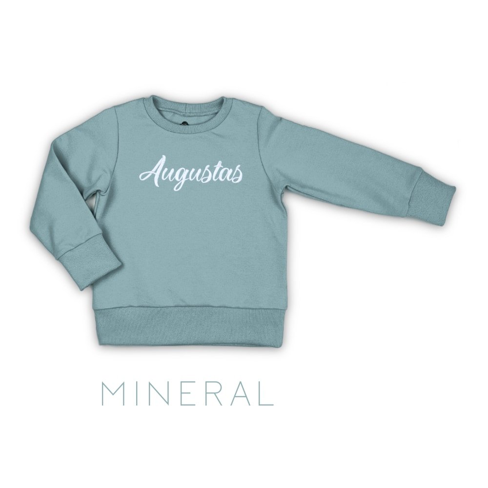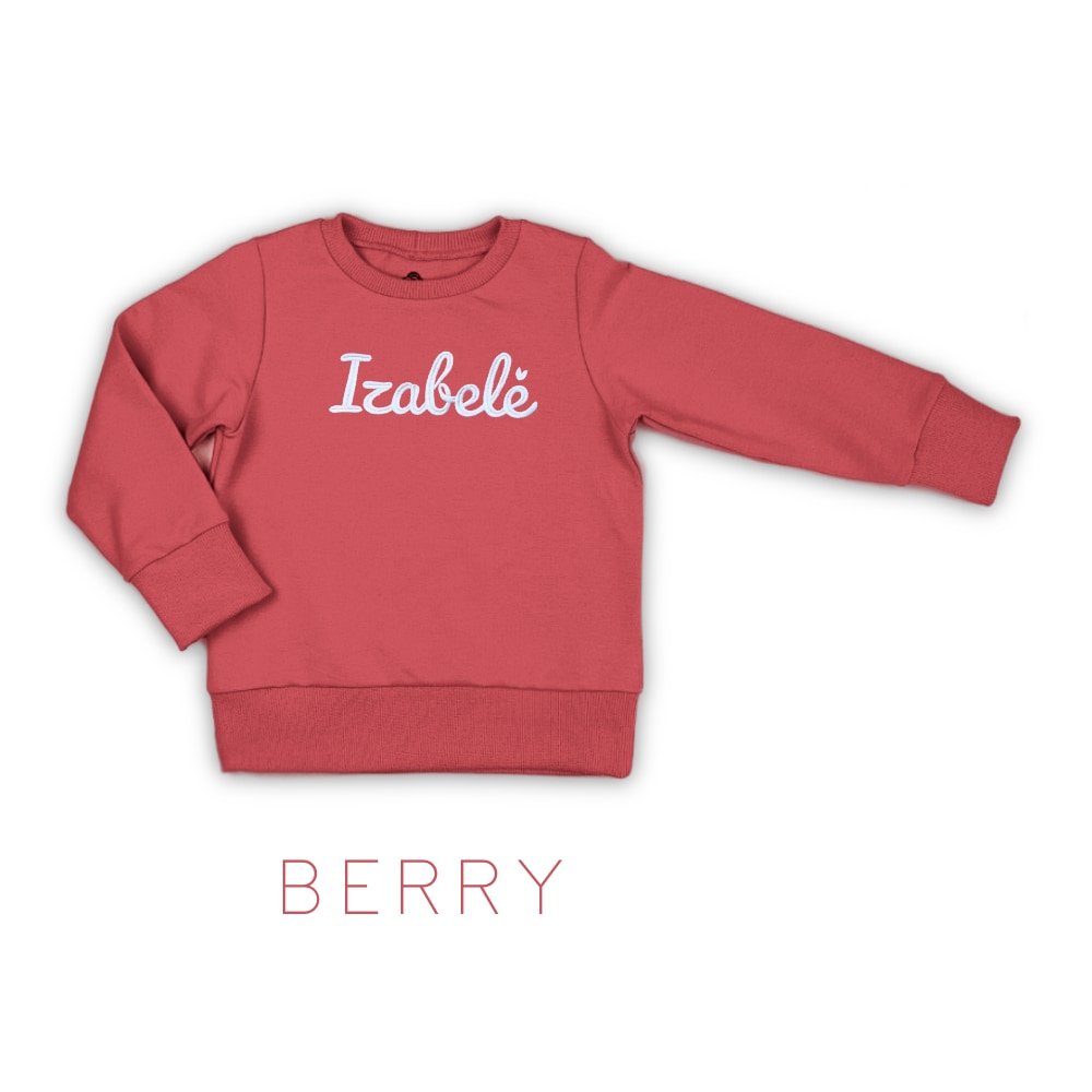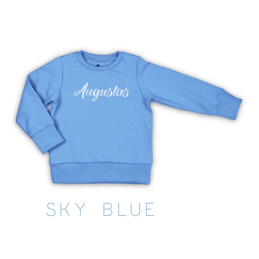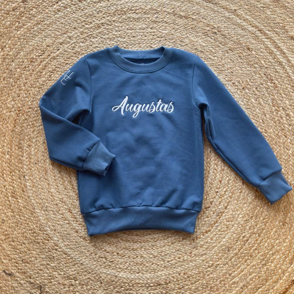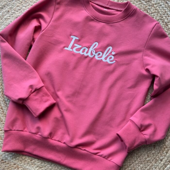 Džemperis su siuvinėtu vardu. Siuvami iš vidutinio storumo kilpinio trikotažo.