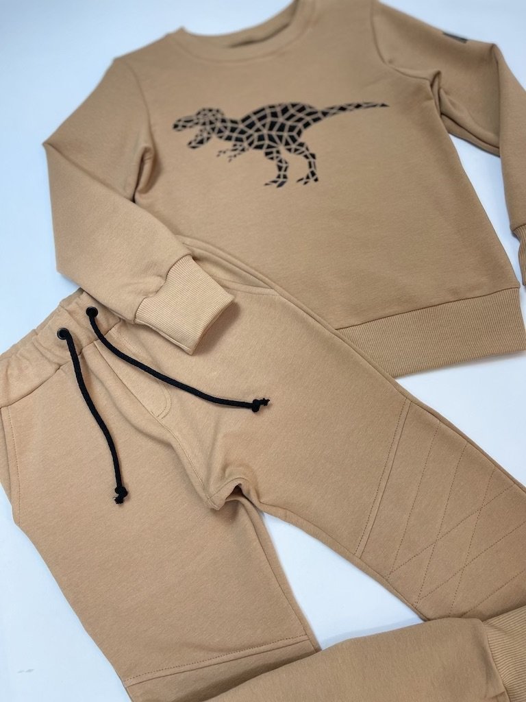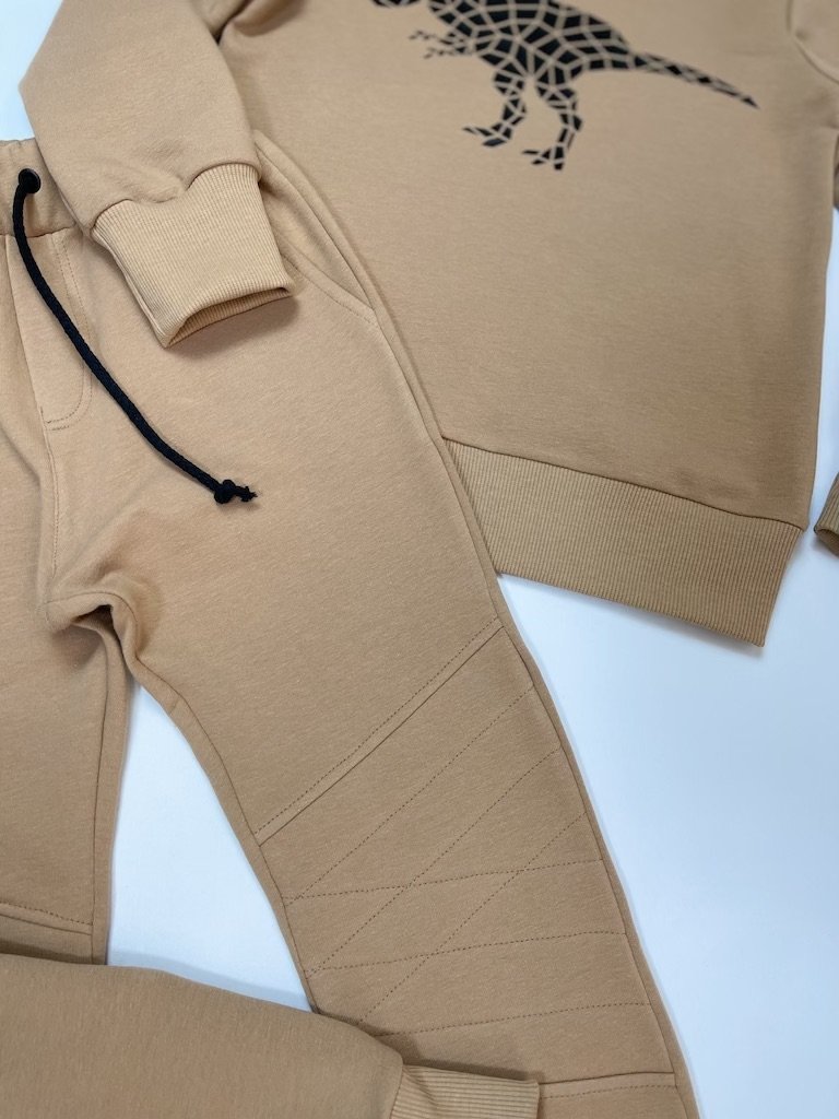 Komplektas smėlinės (camel) spalvos). Aplikacija juoda su trispalve: geltona, žalia, raudona.